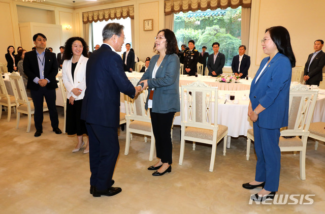 【서울=뉴시스】박진희 기자 = 문재인 대통령이 7일 청와대 본관에서 '국민께 힘이 되는 일 잘하는 공무원' 초청 오찬에 앞서 김현진 식품의약품안전처 사무관과 악수를 하고 있다.