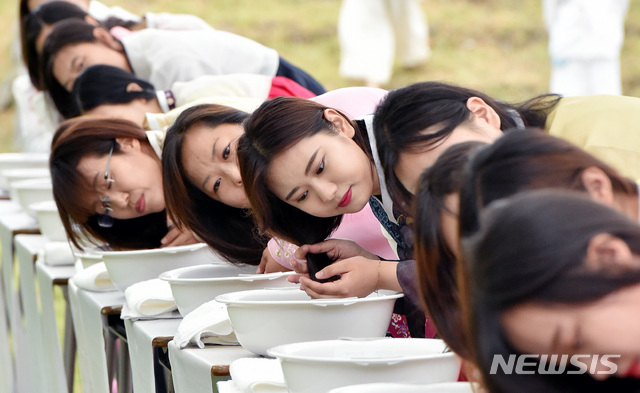 【경산=뉴시스】우종록 기자 = 전통민속문화축제 2019 경산자인 단오제가 열린 7일 오후 경북 경산시 자인면 계정숲 단오마당에서 여성단체협의회 회원들이 한복을 곱게 차려입고 창포물 머리감기 시연을 하고 있다.