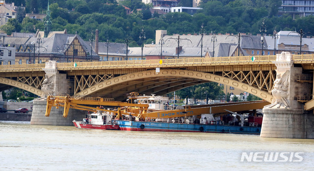 【부다페스트(헝가리)=뉴시스】추상철 기자 = 7일 오후(현지시각) 헝가리 부다페스트 다뉴브강 사고현장에서 클라크 아담 인양선이 머르기트 다리를 통과하고 있다. 2019.06.07.