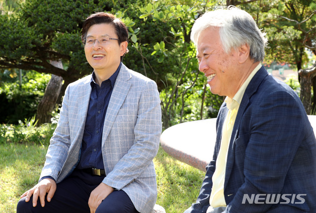 【이천=뉴시스】 박영태 기자 = 자유한국당 황교안 대표가 8일 오전 경기도 이천 설봉산 자락에 위치한 소설가 이문열의 문학사숙 부악문원을 찾아 이문열 작가와 인사를 나누고 있다. 2019.06.08.