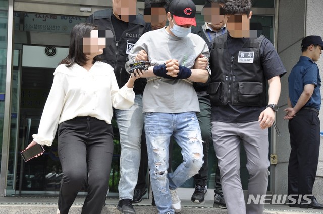 【인천=뉴시스】함상환 기자 = 인천의 한 커피숍에서 흉기로 자신의 친형을 살해한 혐의를 받고있는 A(51)씨가 9일 오후 영장실질심사에 출석하기 위해 인천 삼산경찰서에서 나오고 있다. 2019.06.09.