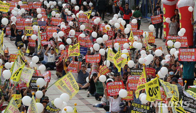 【고양=뉴시스】박주성 기자 = 일산신도시연합회와 운정신도시연합회, 검단신도시연합회 주최로 9일 오후 경기도 고양시 일산서구 주엽동 김현미 국토교통부 장관 지역구 사무실 앞에서 열린 3기 신도시 철회 5차 집회에서 참가자들이 구호를 외치고 있다. 2019.06.09.