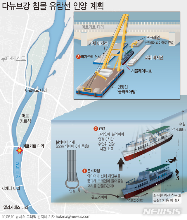【서울=뉴시스】헝가리 부다페스트 다뉴브강에서 침몰한 허블레아니호에 대한 인양 작업이 이르면 10일(현지시간) 시작된다. (그래픽=안지혜 기자)