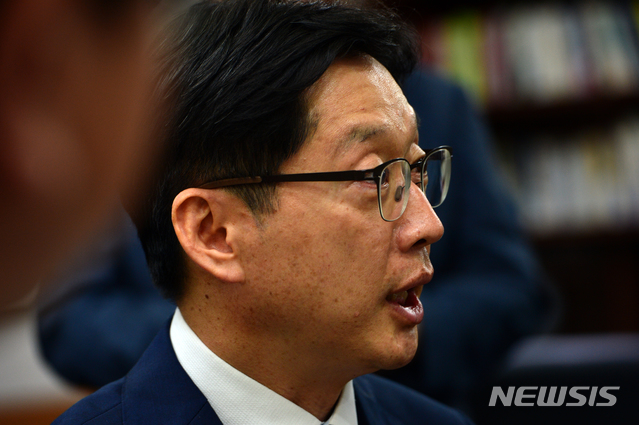 【창원=뉴시스】김기진=10일 김경수 경남지사가 경남도청 집무실에서 양정철 더불어민주당 민주연구원장과 같이 있는 자리에서 양 원장에게 이야기를 하고 있다.