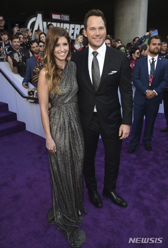 【로스엔젤레스=AP/뉴시스】 할리우드 배우 크리스 프랫(오른쪽)과 작가 캐서린 슈워제네거가 4월22일(현지시간) 미국 로스앤젤레스에 열린 영화 '어벤저스: 엔드 게임' 시사회에 참석하고 있다. 2019.06.10