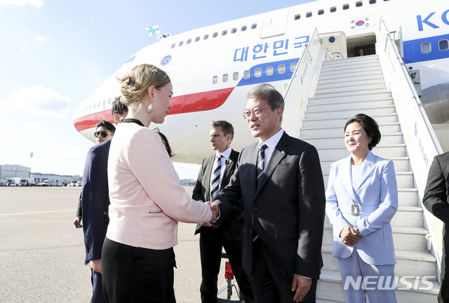 【헬싱키(핀란드)=뉴시스】전신 기자 = 문재인 대통령과 부인 김정숙 여사가 9일(현지시간) 헬싱키 반타 국제공항에 도착해 쿨무니 경제장관 악수하고 있다. 2019.06.10.