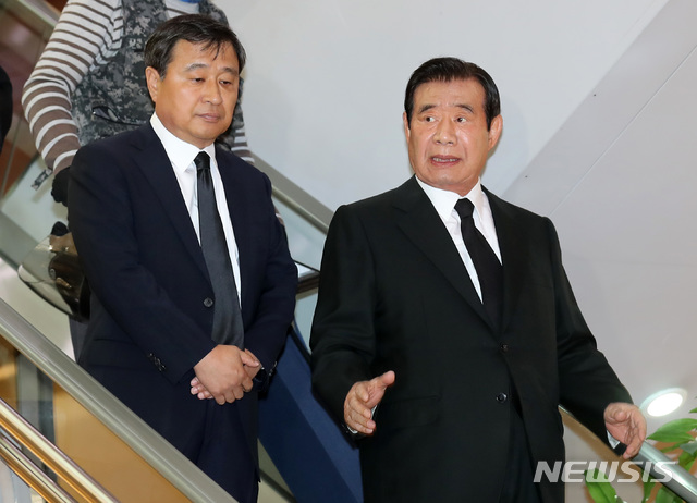 【서울=뉴시스】이영환 기자 = 한광옥(오른쪽) 전 의원이 11일 오전 서울 서대문구 신촌세브란스병원 장례식장에 마련된 고 이희호 여사 빈소로 들어서고 있다. 2019.06.11