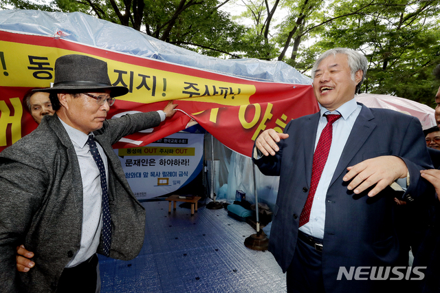 【서울=뉴시스】김병문 기자 = 전광훈 한국기독교총연합회 대표회장 목사가 11일 오후 문재인 대통령 하야 촉구 기자회견을 마치고 1일 릴레이 단식기도를 시작하기 위해 서울 종로구 청와대 사랑채 인근 단식농성 천막으로 들어서고 있다. 2019.06.11.
