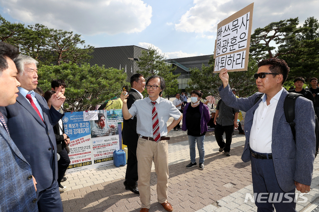 【서울=뉴시스】김병문 기자 = 11일 오후 서울 종로구 청와대 앞 분수대 광장에서 열린 '문재인 대통령 하야 촉구 기자회견'에 참석하는 전광훈 한국기독교총연합회 대표회장 목사 앞에 한 시민이 '빤쓰목사 전광훈은 사퇴하라'는 문구가 적힌 팻말을 들고 있다. 2019.06.11.