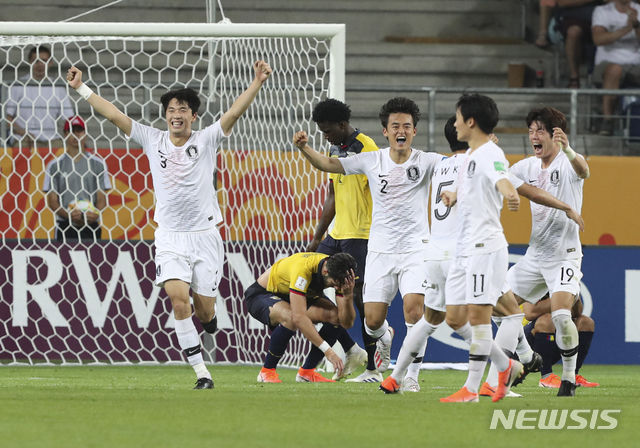 정정용 감독이 이끄는 한국 U20 대표팀은 전반 39분 최준의 결승골로 에콰도르를 1-0으로 꺾고 사상 처음으로 결승에 진출해 15일 우크라이나와 우승을 다툰다. 2019.06.12.