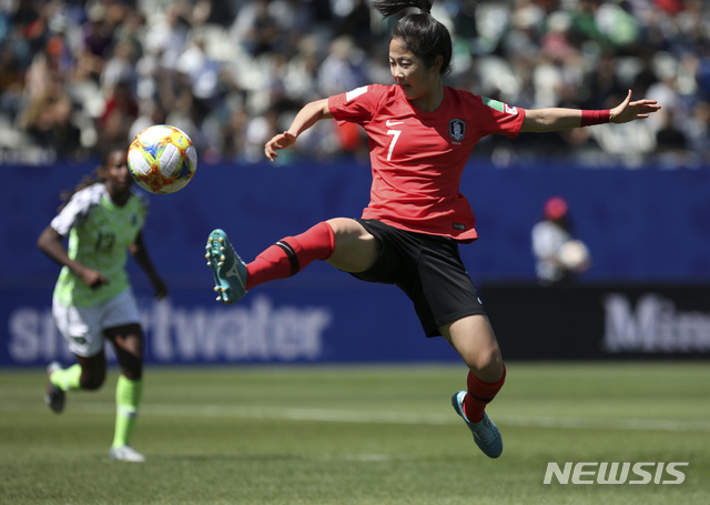 【그로노블(프랑스)=AP/뉴시스】이민아가 12일(현지시간) 프랑스 그르노블의 스타드 데잘프에서 열리고 있는 2019 국제축구연맹(FIFA) 여자 월드컵 나이지리아와의 조별리그 A조 2차전 경기를 하고 있다.