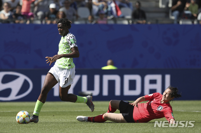 【그로노블(프랑스)=AP/뉴시스】황보람(오른쪽)이 12일(현지시간) 프랑스 그르노블의 스타드 데잘프에서 열리고 있는 2019 국제축구연맹(FIFA) 여자 월드컵 나이지리아와의 조별리그 A조 2차전에서 오쇼알라의 공격을 막으려 시도하고 있다.