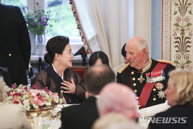 【오슬로(노르웨이)=뉴시스】전신 기자 = 노르웨이를 국빈 방문 중인 문재인 대통령 부인 김정숙 여사가 12일(현지시간) 오슬로 노르웨이 왕궁에서 열린 국빈 만찬에서 하랄 5세 국왕과 대화하고 있다. 2019.06.13.