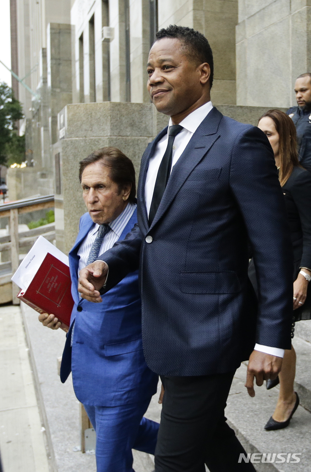 【뉴욕=AP/뉴시스】성추행 혐의로 체포된 배우 쿠바 구딩 주니어(51)가 13일(이하 현지시간) 변호사 마크 헬러와 함께 법정을 나서고 있다.