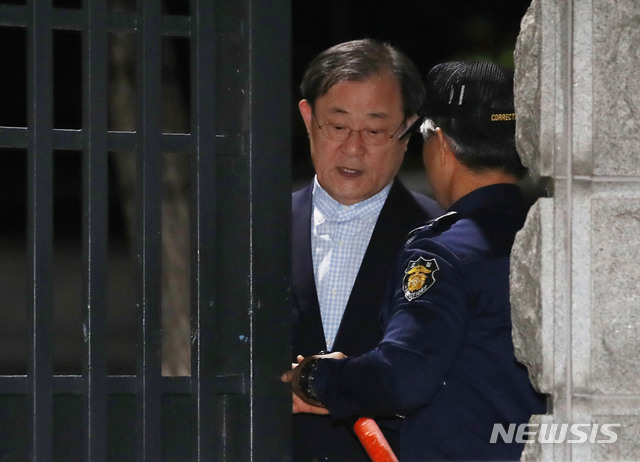 【의왕=뉴시스】김진아 기자 = 박근혜 정부 시절 국정원 특수활동비를 청와대에 상납했다는 혐의로 기소돼 1심과 항소심에서 실형을 선고받고 수감 중이던 이병기 전 국정원장이 상고심에서 구속기간 만료로 풀려나 14일 서울구치소에서 나오고 있다. 2019.06.14.