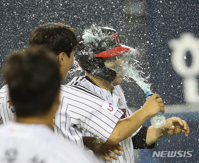 【서울=뉴시스】 고범준 기자 = 12일 오후 서울 송파구 잠실야구장에서 열린 '2019 신한은행 MY CAR KBO리그' LG 트윈스-롯데 자이언츠 경기, 연장 10회말 2사 1,3루 LG 오지환의 스트라이크 낫아웃 폭투 때 3루주자 김현수가 홈 베이스를 밟아 득점에 성공하자 동료들이 물을 뿌리고 있다. 이날 LG는 4-3으로 승리를 거뒀다. 2019.06.12.
