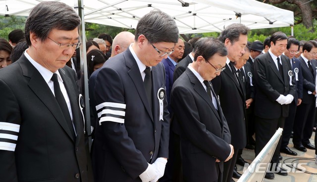 【서울=뉴시스】홍효식 기자 = 14일 오전 서울시 동작구 국립서울현충원에서 열린 김대중 전 대통령의 부인 고 이희호 여사의 안장식에서 이낙연 국무총리와, 문희상 국회의장, 유족 및 참석자들이 묵념하고 있다. 2019.06.14.