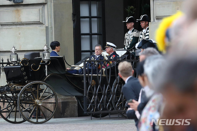 【스톡홀름(스웨덴)=뉴시스】전신 기자 = 스웨덴을 국빈 방문 중인 문재인 대통령이 14일 스톡홀름 스웨덴 왕궁 앞에서 칼 구스타프 16세 국왕과 마차를 타고 공식환영식에 입장하고 있다. 2019.06.14.