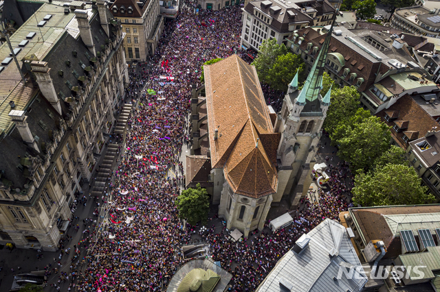 스위스 전역에서 수천 명의 여성이 공정한 임금, 여성에 대한 성희롱과 폭력의 종식을 요구하며 일을 중단한 채 거리로 나와 브라를 불태우고 교통을 차단하며 시위를 벌이고 있다. 2019.06.15.