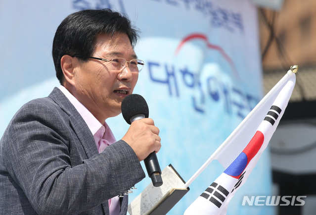 【서울=뉴시스】박미소 기자 = 자유한국당 홍문종 의원이 15일 오후 서울 용산구 서울역광장에서 열린 태극기집회에서 자유한국당 탈당을 선언하고 있다.