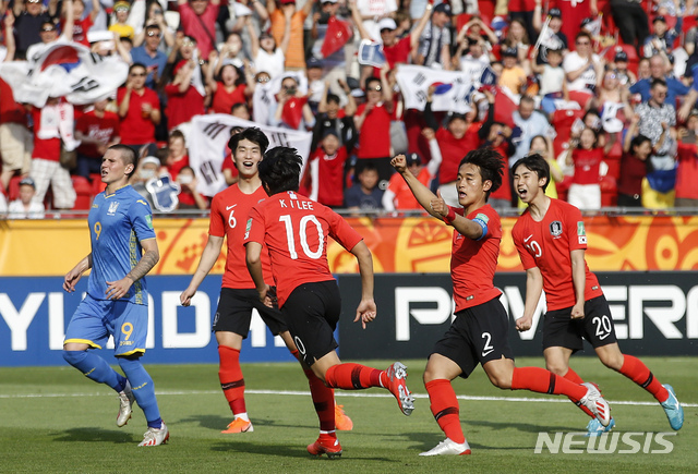 【우치(폴란드)=AP/뉴시스】이강인(앞)이 15일(현지시간) 폴란드 우치의 우치 스타디움에서 열린 2019 국제축구연맹(FIFA) U20 월드컵 우크라이나와의 결승전 전반 PK를 넣고 동료들과 기뻐하고 있다.