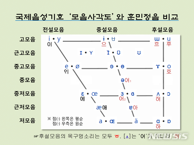 【서울=뉴시스】 국제음성기호(IPA) ‘모음 사각도’와 훈민정음 비교. 후설모음의 목구멍소리는 모두 ‘ㆆ(여린히읗)’. 한글맞춤법 외래어표기법에선 [ʌ]와 [ə]를 모두 ‘어’라 하였으나, [ʌ]는 ‘ㆆㅓ’임.