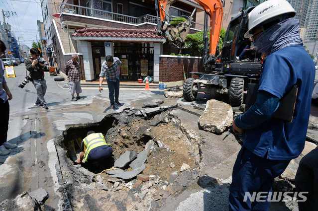 【대구=뉴시스】우종록 기자 = 17일 오후 대구 수성구 두산동 들안길초등학교 인근 도로에 지름 50cm 크기의 싱크홀이 발생해 행정당국이 도로를 통제하고 사고 원인을 조사하고 있다. 2019.06.17.