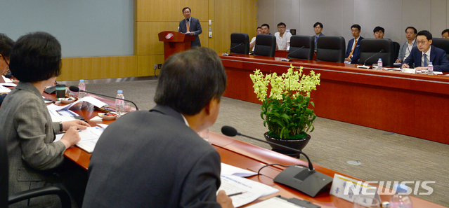 【나주=뉴시스】변재훈 기자 = 홍일표 산업통상자원중소벤처기업위원회 위원장 등 국회 산자위 소속 자유한국당 의원들이 17일 오후 전남 나주 빛가람동 한국전력 본사를 방문해 현안보고를 청취하고 있다. 2019.06.17.
