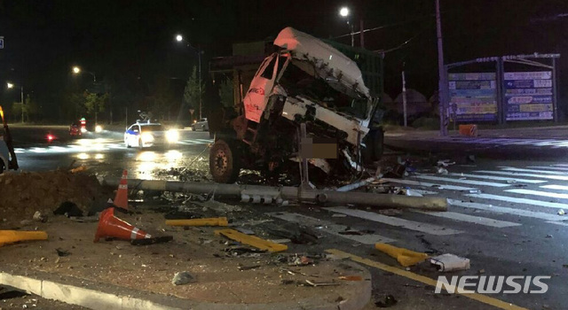 【아산=뉴시스】함형서 기자 =18일 오전 1시 19분께 충남 아산시 음봉면 산동사거리에서 직진하던 45인승 버스와 맞은편에서 좌회전하던 27t 화물차량이 충돌해 34명의 사상자가 발생했다.2019.06.18(사진=충남소방본부 제공)