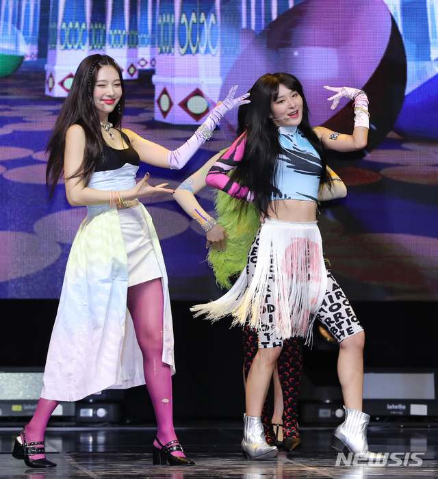 【서울=뉴시스】조수정 기자 = 그룹 '레드벨벳'이 19일 오후 서울 용산구 한남동 블루스퀘어에서 열린 새 미니앨범 '더 리브 페스티벌' 데이 원(The ReVe Festival' Day 1)' 쇼케이스에서 타이틀곡 '짐살라빔'을 선보이고 있다. 왼쪽부터 조이, 슬기. 2019.06.19. [email protected]