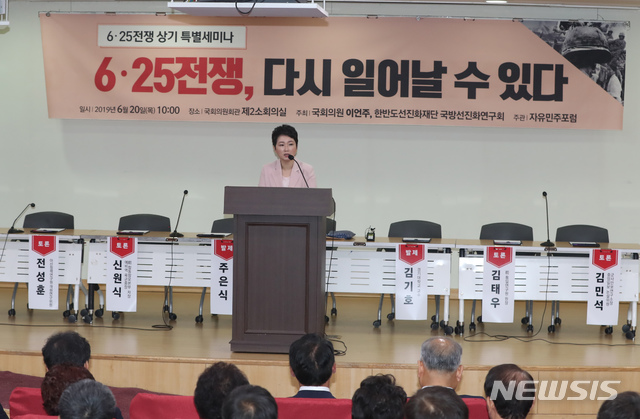 【서울=뉴시스】고승민 기자 = 20일 서울 여의도 국회 의원회관에서 열린 '6.25전쟁, 다시 일어날 수 있다' 특별세미나에서 무소속 이언주 의원이 개회사를 하고 있다. 2019.06.20.