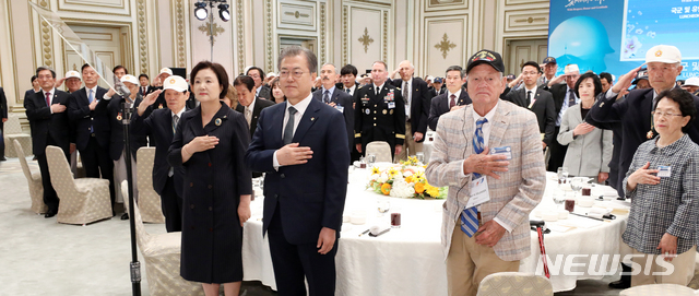 【서울=뉴시스】전신 기자 = 문재인 대통령이 24일 청와대 영빈관에서 열린 국군 및 유엔군 참전유공자 초청 오찬에서 국기에 경례하고 있다. 2019.06.24.
