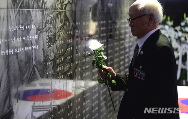 【수원=뉴시스】 김종택 기자 = 6.25 전쟁 69주년을 하루 앞둔 24일 오전 경기 수원시 팔달구 현충탑 위패실에서  6.25참전용사가 헌화 하고 있다. 2019.06.24.