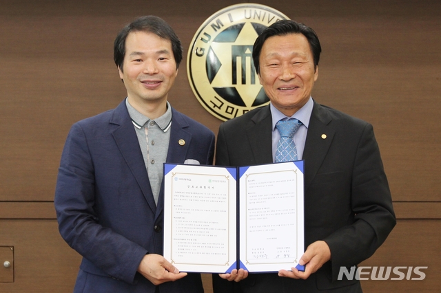 【구미=뉴시스】박홍식 기자 = 정창주(오른쪽) 구미대학교 총장이 24일 본관 회의실에서 이경식 서울 인덕공업고등학교 교장과 군(軍) 부사관 양성을 위한 상호교류 협약(MOU)을 체결하고 있다. 2019.06.25 (사진=구미대 제공)