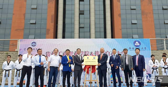 【천안=뉴시스】이종익 기자 = 충남 천안 소재 백석대학교(총장 장종현)는 25일 오전 중국 남서부 구이저성(贵州省)의 구이저양시(贵阳市) 구이저우공상직업학원(贵州工商职业学院)에서 중국 내 태권도에 관심을 갖고 있는 학생들의 태권도 교육 시설을 위한 '백석대 태권도 교육센터' 현판식을 진행했다. 2019.06.25. (사진=백석대 제공)