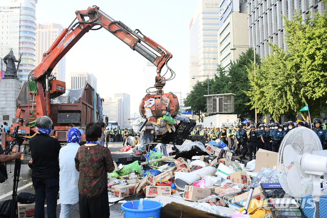 【서울=뉴시스】김병문 기자 = 서울시가 25일 오전 서울 종로구 광화문광장에 설치된 대한애국당의 농성 천막을 철거하고 있다. 2019.06.25.(사진=서울시 제공)