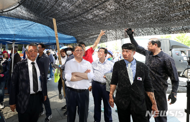 【서울=뉴시스】김선웅 기자 = 대한애국당(우리공화당으로 당명 변경)이 광화문광장에 불법 설치한 천막에 대한 서울시의 강제 철거 행정집행이 실시된 25일 서울 종로구 광화문광장에서 대한애국당 조원진 대표가 붋법 천막 재설치를 지켜보고 있다. 2019.06.25.