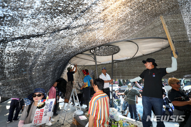 【서울=뉴시스】김선웅 기자 = 대한애국당(우리공화당으로 당명 변경)이 광화문광장에 불법 설치한 천막에 대한 서울시의 강제 철거 행정집행이 실시된 25일 서울 종로구 광화문광장에서 대한애국당원들이 불법 천막을 재설치하고 있다. 2019.06.25.