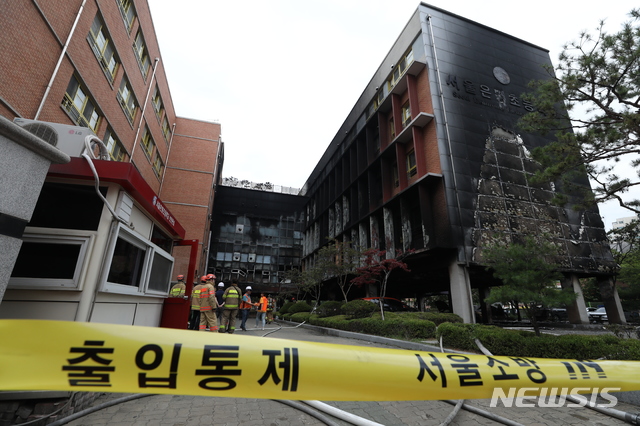 【서울=뉴시스】김진아 기자 = 26일 오후 서울 은평구 은명초등학교에서 화재가 발생해 건물이 불타 그을려 있다. 2019.06.26.