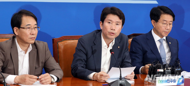【서울=뉴시스】 박영태 기자 = 27일 오전 서울 여의도 국회에서 열린 더불어민주당 정책조정회의에서 이인영 원내대표가 발언하고 있다. 2019.06.27.
