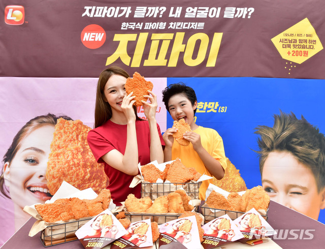 【서울=뉴시스】박미소 기자 = 지난 26일 서울 종로구 롯데리아 혜화점에서 ‘지파이’ 출시를 기념해 모델들이 신제품을 선보이고 있다. 지파이는 바삭하고 촉촉한 식감의 통 가슴살 치킨 디저트로 얼굴 만한 대형 사이즈가 특징인 제품이다.