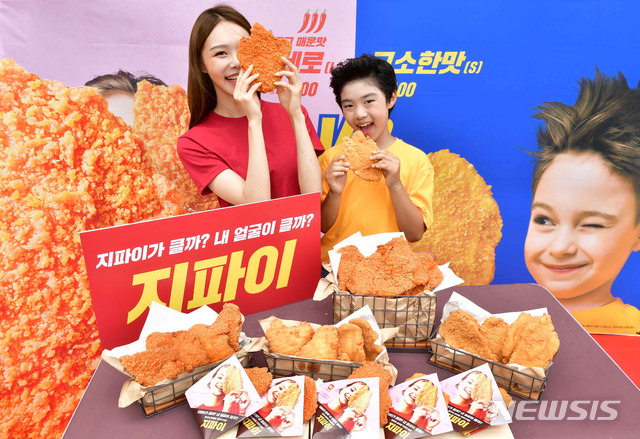 【서울=뉴시스】박미소 기자 =지난 26일 서울 종로구 롯데리아 혜화점에서 ‘지파이’ 정식 출시를 기념해 모델들이 신제품을 선보이고 있다. 지파이는 바삭하고 촉촉한 식감의 통 가슴살 치킨 디저트로 얼굴 만한 대형 사이즈가 특징인 제품이다.