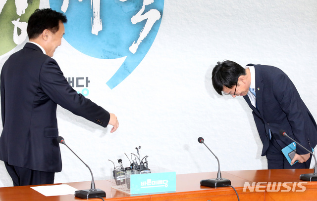 【서울=뉴시스】 박영태 기자 = 손학규 바른미래당 대표가 28일 오전 서울 여의도 국회를 찾은 김상조 청와대 신임 정책실장과 만나 인사를 나누고 있다. 2019.06.28.