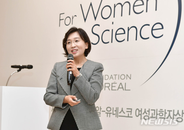 【서울=뉴시스】박미소 기자 = 28일 오전 서울 관악구 서울대학교 교수회관 컨벤션홀에서 열린  ‘2019 제 18회 한국 로레알-유네스코 여성과학자상’ 시상식에서 학술진흥상을 수상한 이미옥 교수가 강연을 하고 있다.