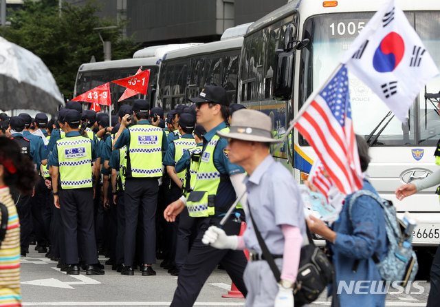 서울 도심에서 트럼프 대통령 방한 찬반집회가 잇따라 열리고 있는 29일 서울 중구 서울시청 인근에 경찰인력이 배치되어 있다. 2019.06.29.