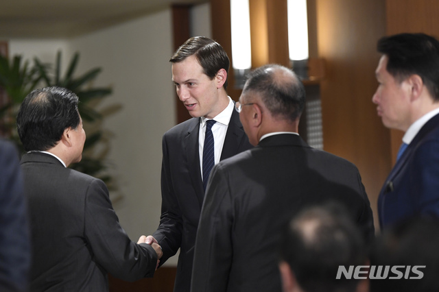 【서울=AP/뉴시스】도널드 트럼프 미국 대통령의 사위 자레드 쿠시너 백악관 선임보좌관이 30일 오전 서울 하얏트 호텔에서 열린 '트럼프 대통령 국내 경제인 대화'에 앞서 국내 주요 대기업 총수들과 만나 인사를 나누고 있다. 2019.06.30.