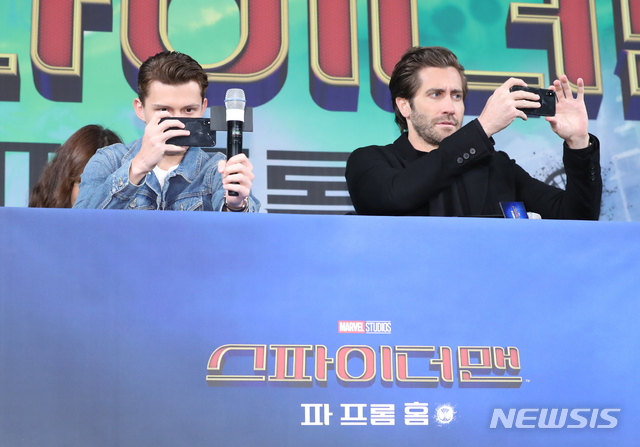 【서울=뉴시스】조수정 기자 = 배우 톰 홀랜드(Tom Holland. 왼쪽), 제이크 질렌할(Jake Gyllenhaal)이 영화 '스파이더맨 : 파 프롬 홈' 내한 기자간담회가 열린 1일 오전 서울 종로구 포시즌스호텔에서 취재진에게 플래시를 터트려달라고 요청한 뒤 휴대전화기로 사진을 찍고 있다. 영화 '스파이더맨 : 파 프롬 홈'은 2일 개봉한다. 2019.07.01. [email protected]