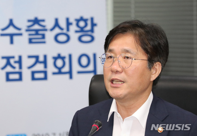 【서울=뉴시스】 전진환 기자 = 일본정부가 반도체와 OLED(유기발광다이오드) 소재의 한국 수출규제를 발표한 가운데 1일 오후 수출상황 점검회의가 열린 서울 종로구 한국무역보험공사 대회의실에서 성윤모 산업통상자원부장관이 모두발언을 하고있다. 2019.07.01.