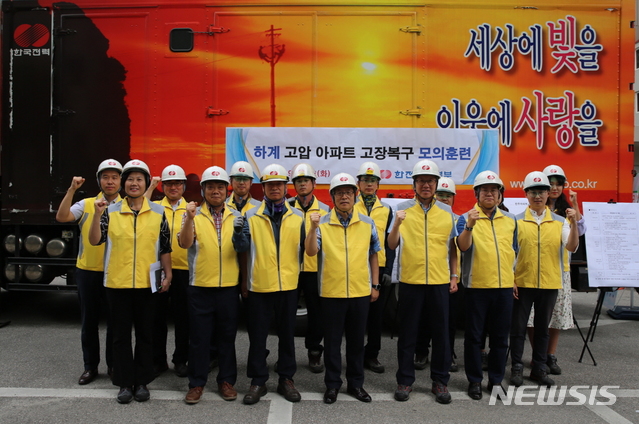【춘천=뉴시스】한윤식 기자 = 한전 강원본부(본부장 이봉희)는 2일 춘천시 온의동 한주아파트에서 하계 고압 아파트 고장복구 모의훈련을 실시했다. 이번 훈련은 여름철 배전설비 고장시 대응체계 확립과 아파트 수전설비 정전시 비상복구체계를 점검하기 위해 마련했다. 2019.07.02. (사진=한전 강원지역본부 제공)