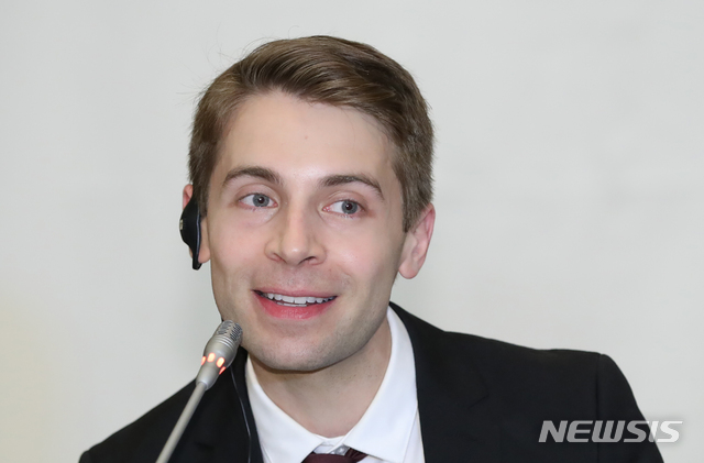 【서울=뉴시스】조수정 기자 = 한국이미지커뮤니케이션연구원(CICI), 문화체육관광부, 해외문화홍보원, 외교부 주최 '제10회 문화소통포럼 CCF 2019' 토론회가 열린 2일 오전 서울 용산구 한남동 하얏트호텔에서 제프 벤자민 미국 빌보드 K-POP 칼럼니스트가 발언하고 있다. 이날 토론회는 세계 각국 다양한 분야의 콘텐츠 크리에이터 등 문화소통계 패널들이 ‘콘텐츠의 트렌드와 소통방식’을 주제로 토론했다. 2019.07.02. [email protected]